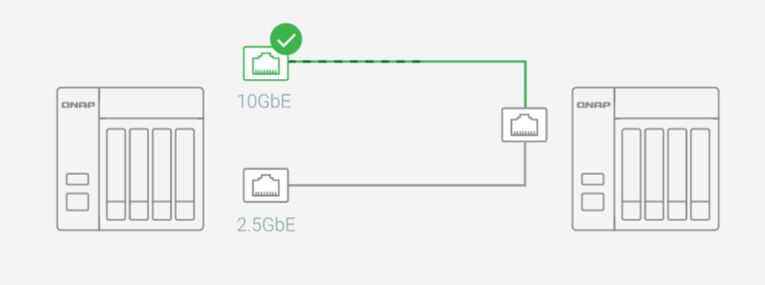 Интеллектуальная сеть | NAS QNAP автоматически выбирает оптимальное физические сетевое соединение для вашей задачи, а также отрабатывает отказы для обеспечения непрерывного обслуживания и переключается обратно при повторном подключении более скоростной сетевой линии. |